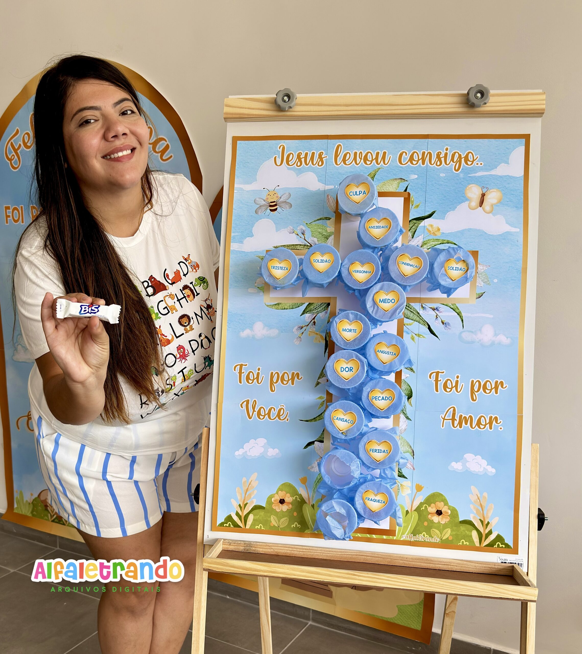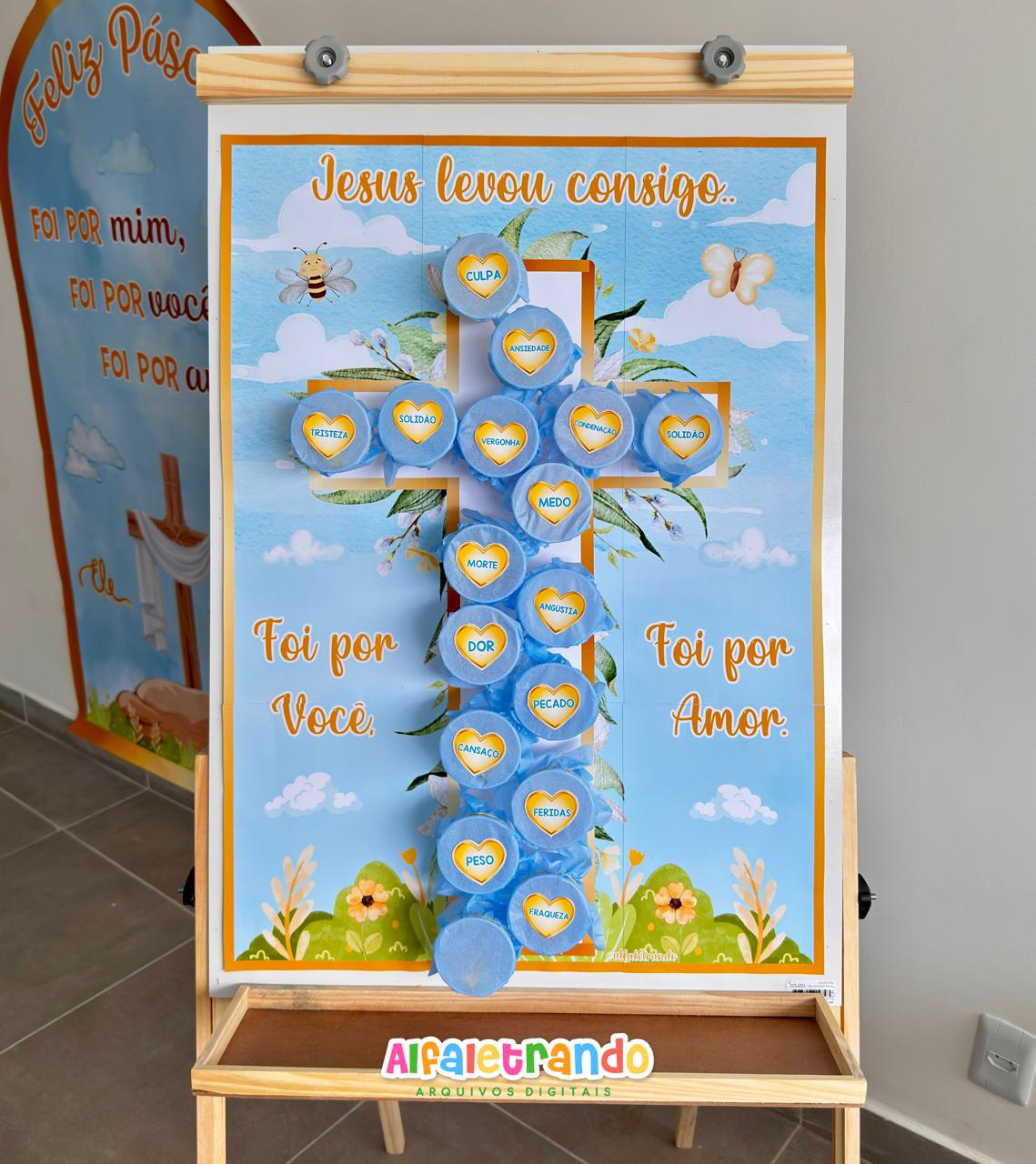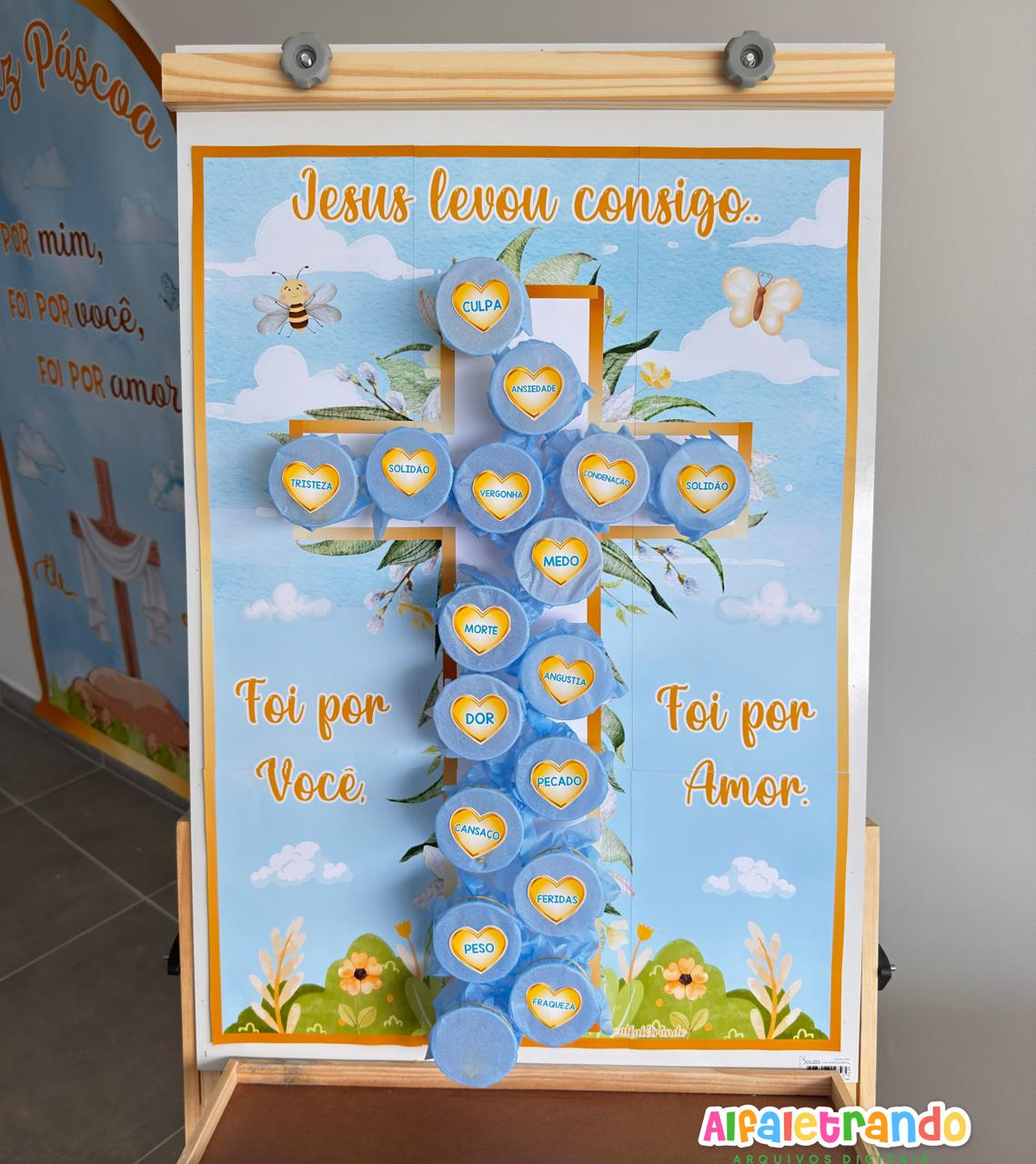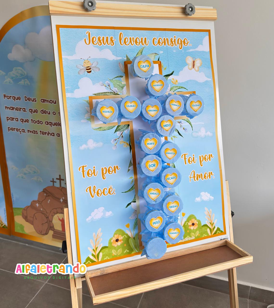 A proposta traz um painel em formato de cruz com elementos delicados e frases inspiradoras, além de palavras que representam tudo que Jesus levou para a cruz por amor a nós.