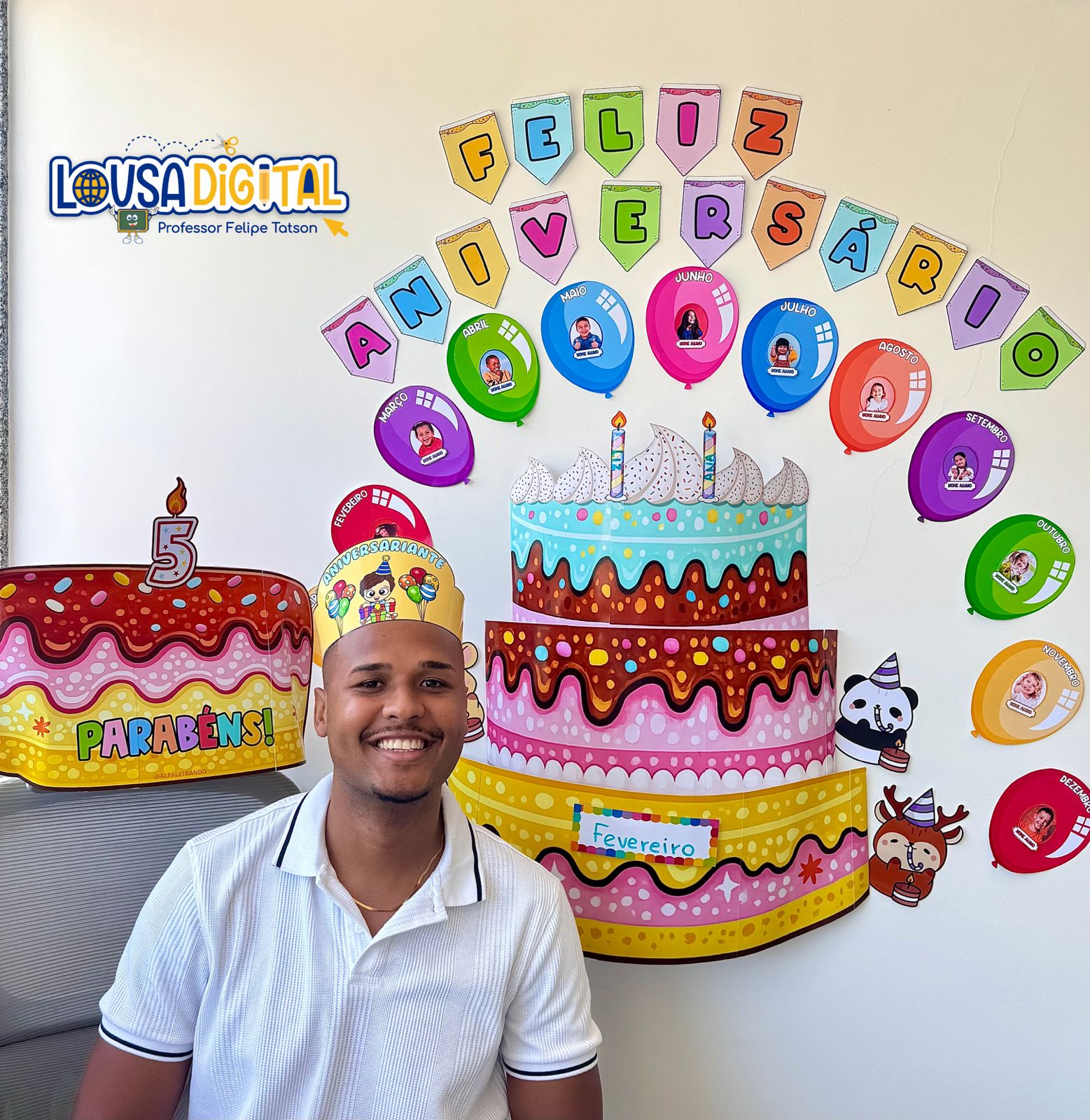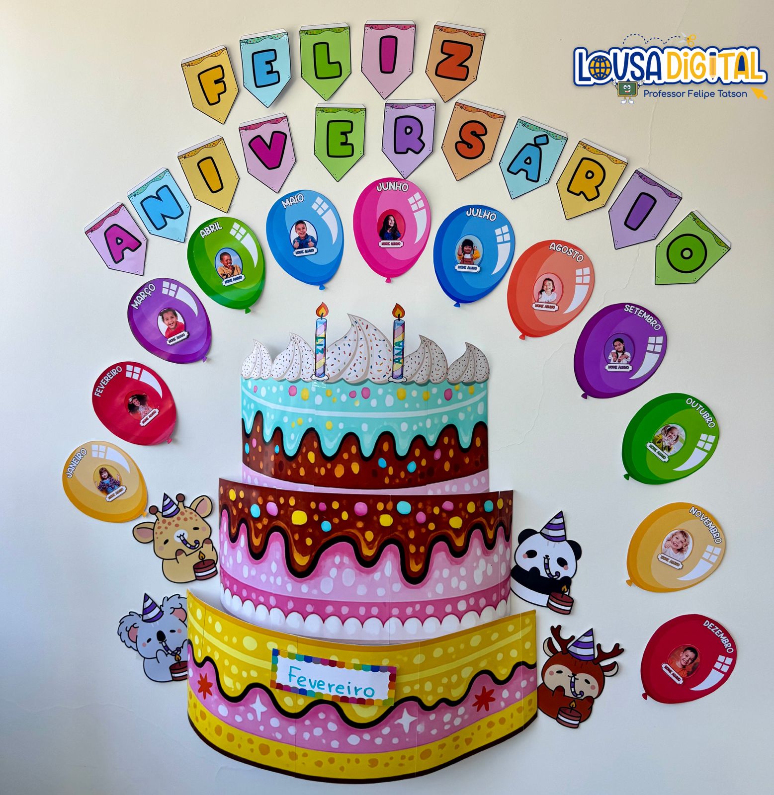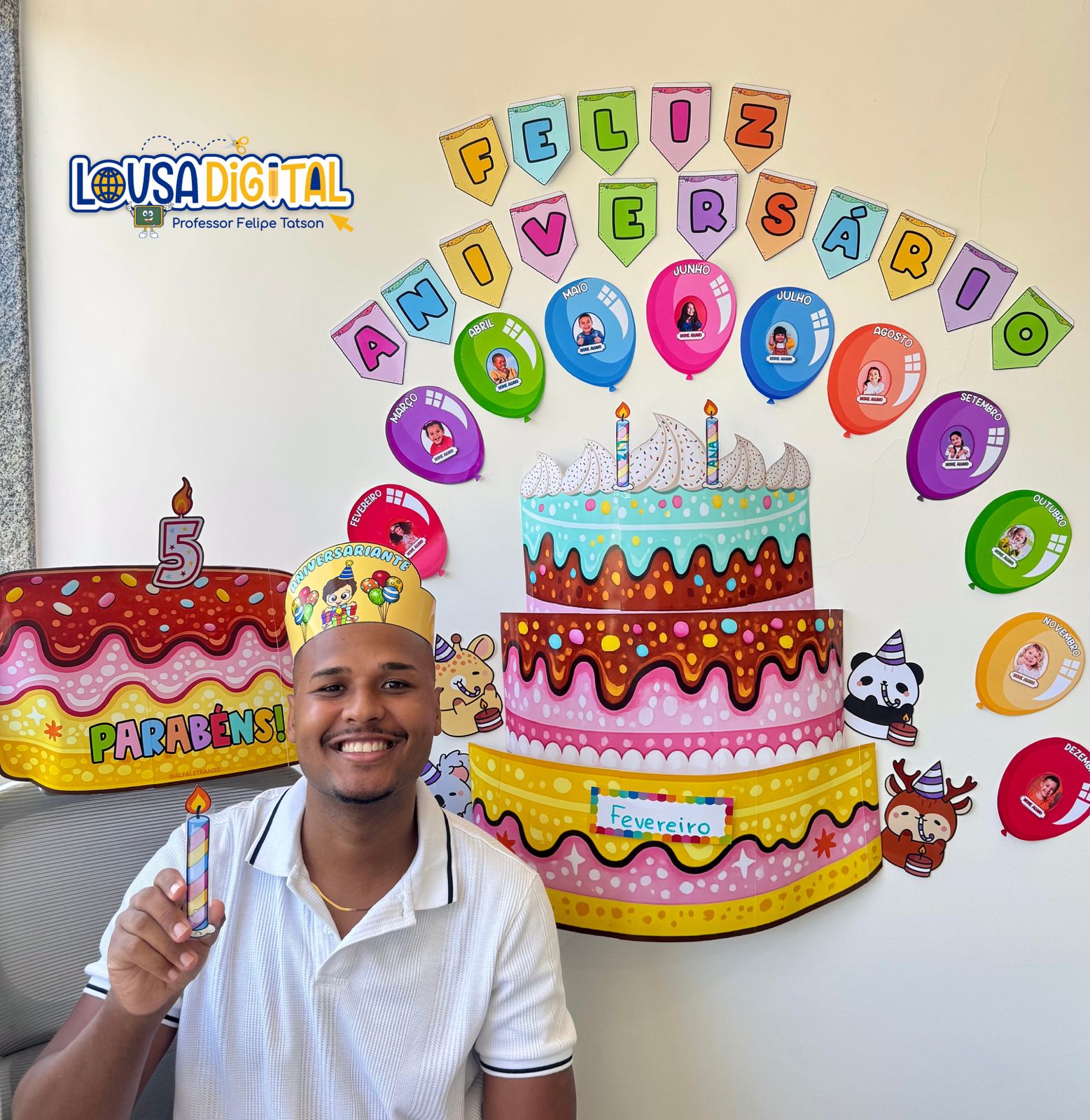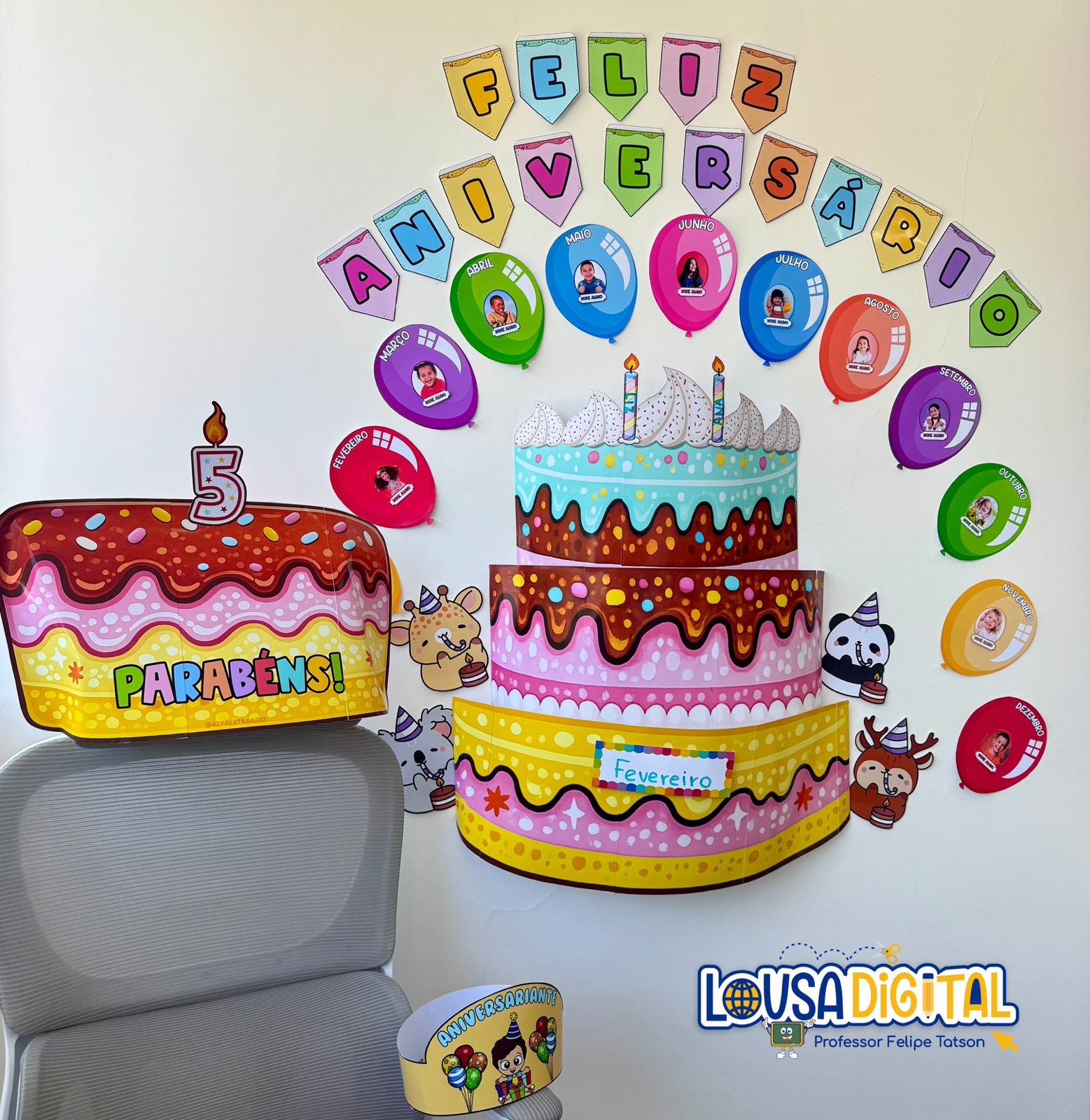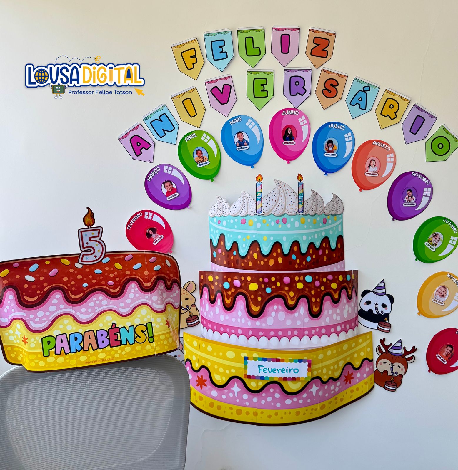 ✨ O Kit Aniversariante da Turma – Bolo 3D vai em PDF para você imprimir e montar um cantinho lindo e super divertido para comemorar o aniversário dos alunos durante o ano todo! Perfeito para fotos e para deixar a sala ainda mais acolhedora.