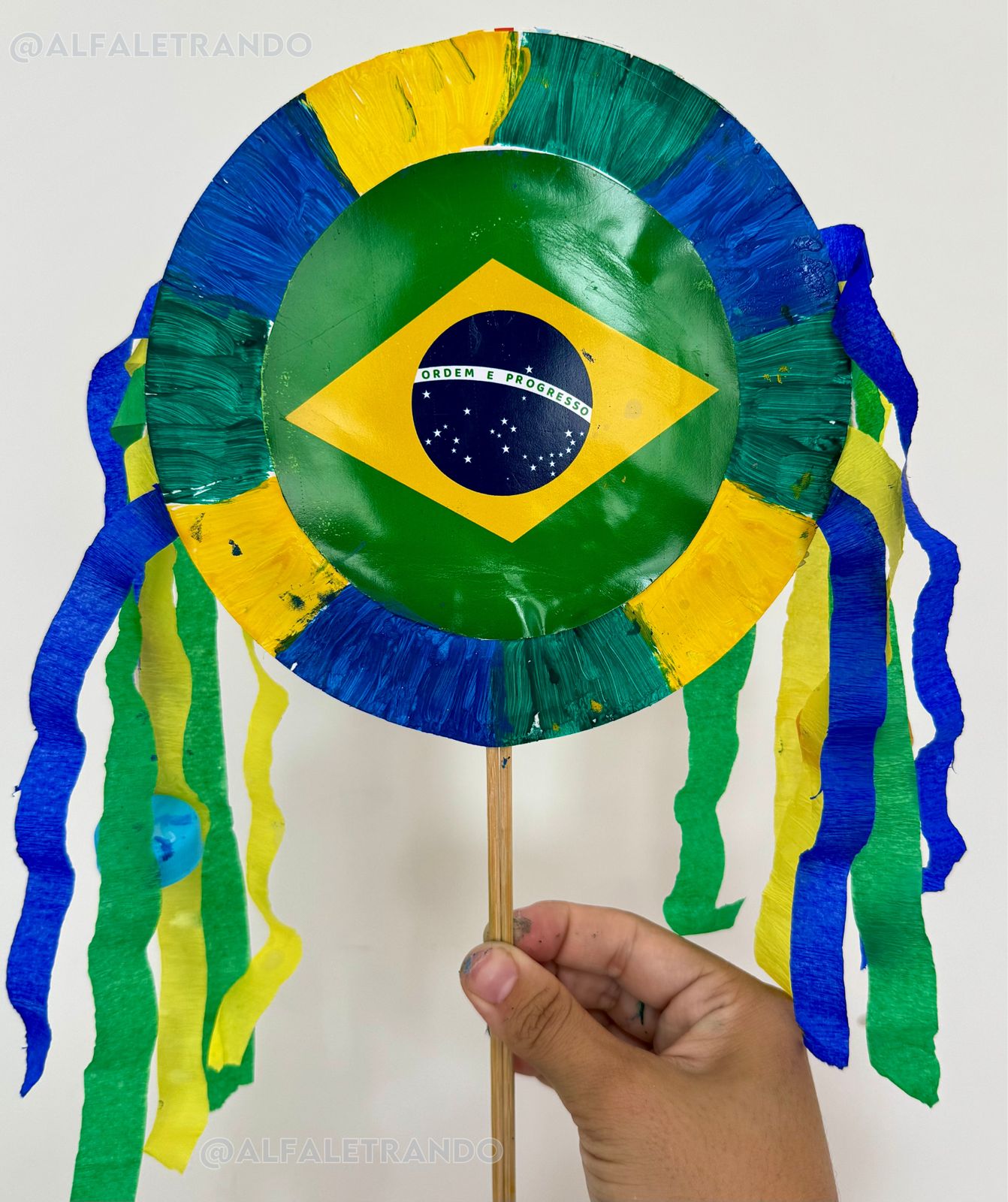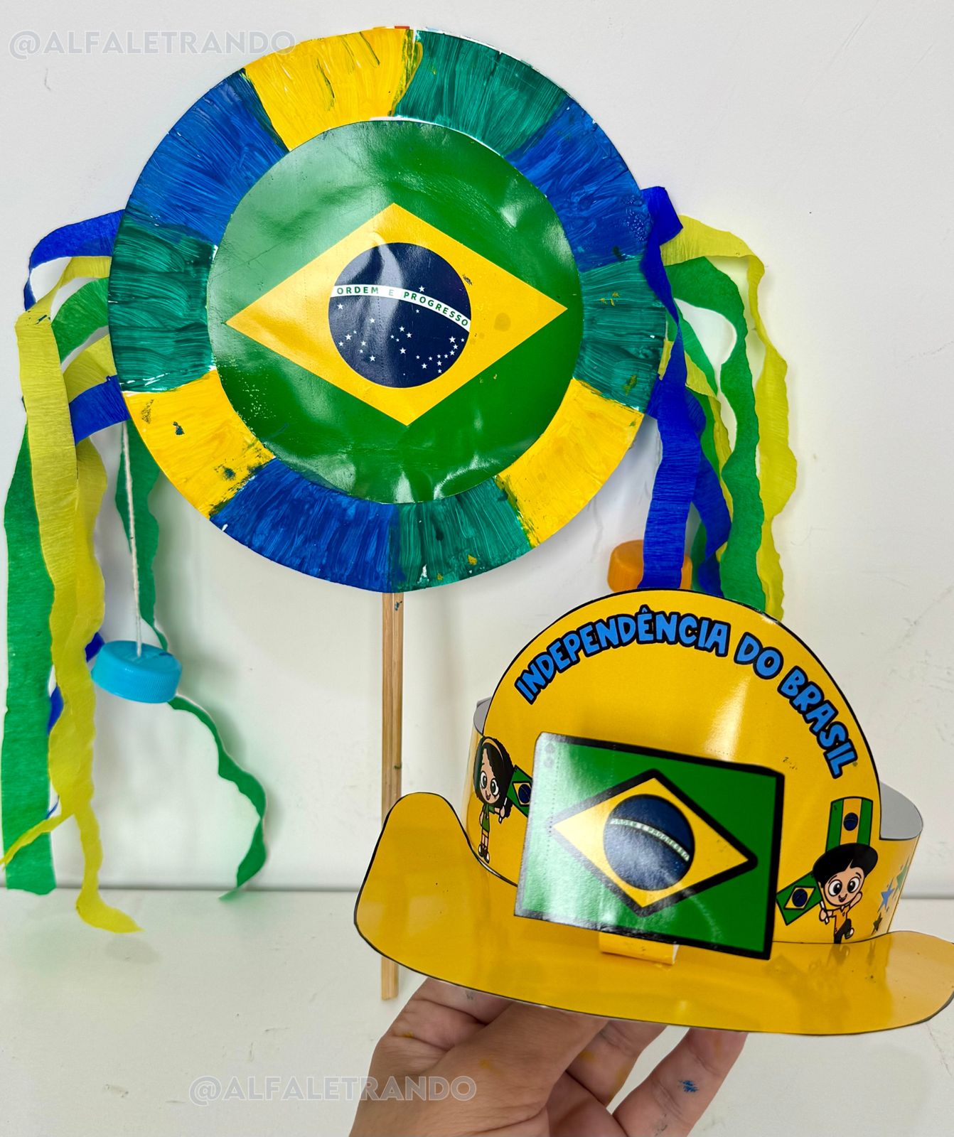 O mini kit possui uma linda atividade, a carretilha de tampinhas com estampa da bandeira brasileira e um lindo boné da independência para os alunos saírem orgulhosos neste 7 de setembro! 💚🇧🇷💛