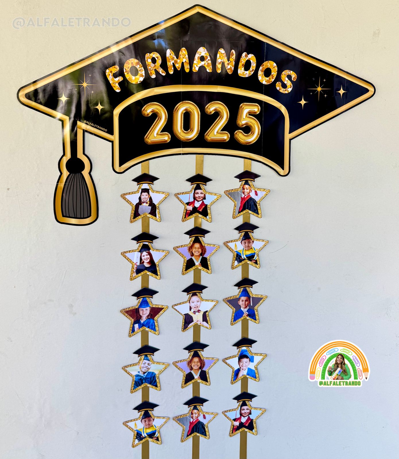 🎓 O painel Anuário é editável e vem todo no tema preto e dourado com estrelas lindas que são molduras para fotos dos formandos de 2025.