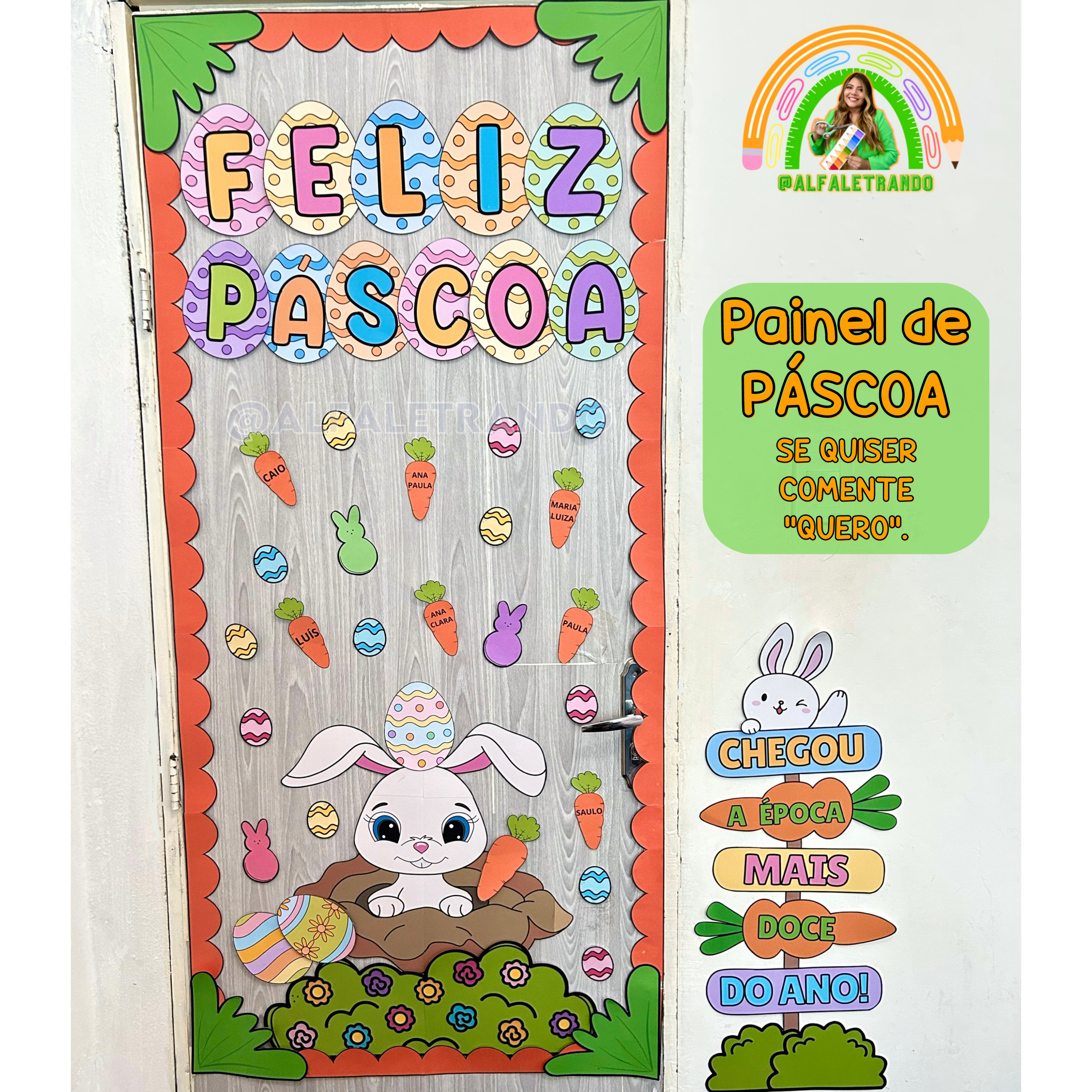 Este painel conta com frase ilustrada em ovinhos coloridos, margem, cenourinhas, arte coelho na toca exclusiva e uma linda decoração lateral para a sua porta! ????