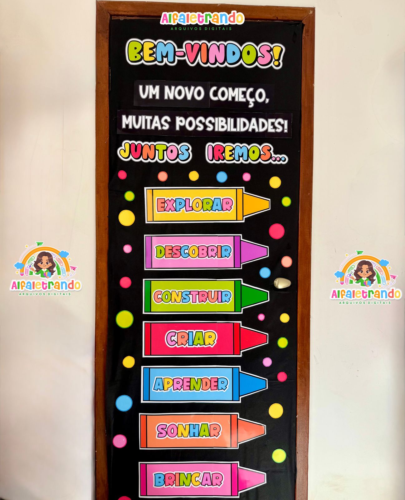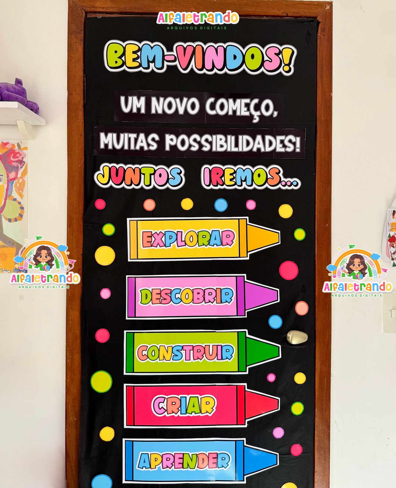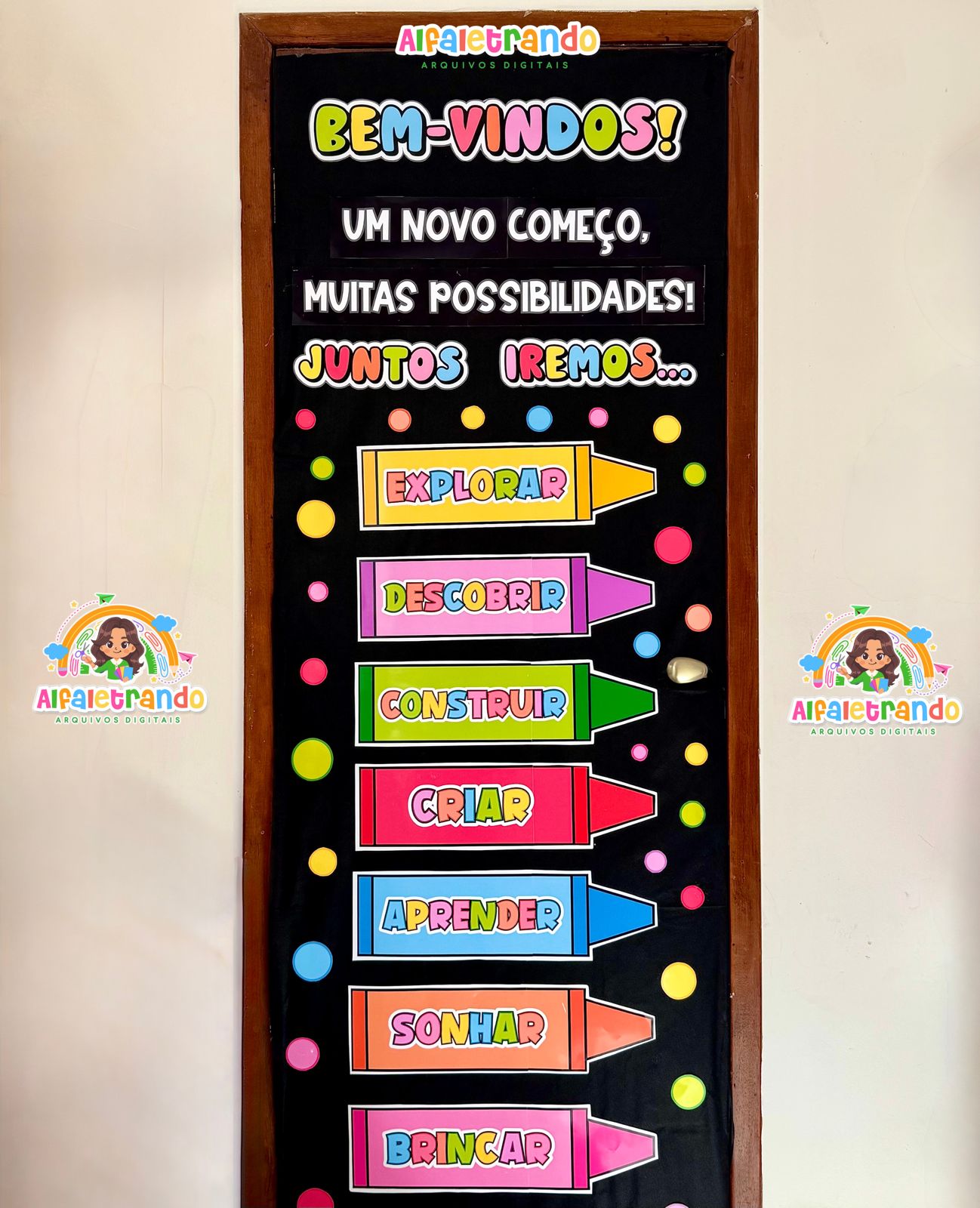 🌈 Com visual Color Black (fundo preto + cores vibrantes), o painel traz frases de boas-vindas e lápis com palavras que inspiram a turma: explorar, descobrir, construir, criar, aprender, sonhar e brincar.