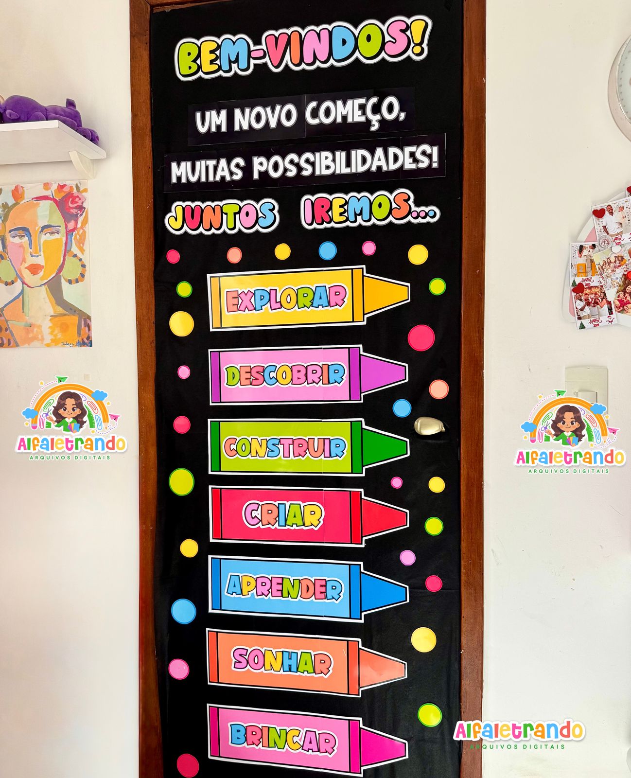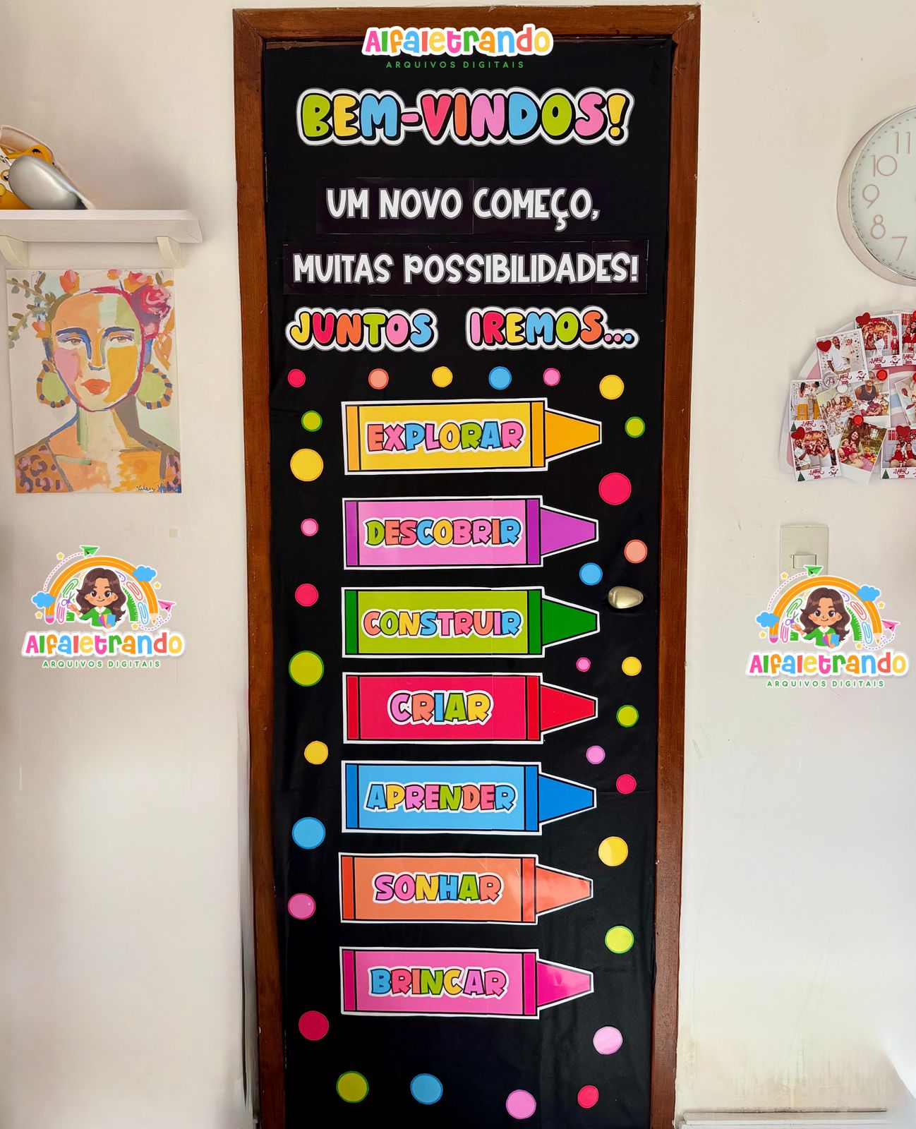 🖍️ Painel de Porta “Bem-vindos – Muitas Possibilidades” é um recurso digital em PDF, pronto para imprimir e montar, perfeito para deixar a entrada da sala acolhedora, alegre e cheia de cor na volta às aulas.