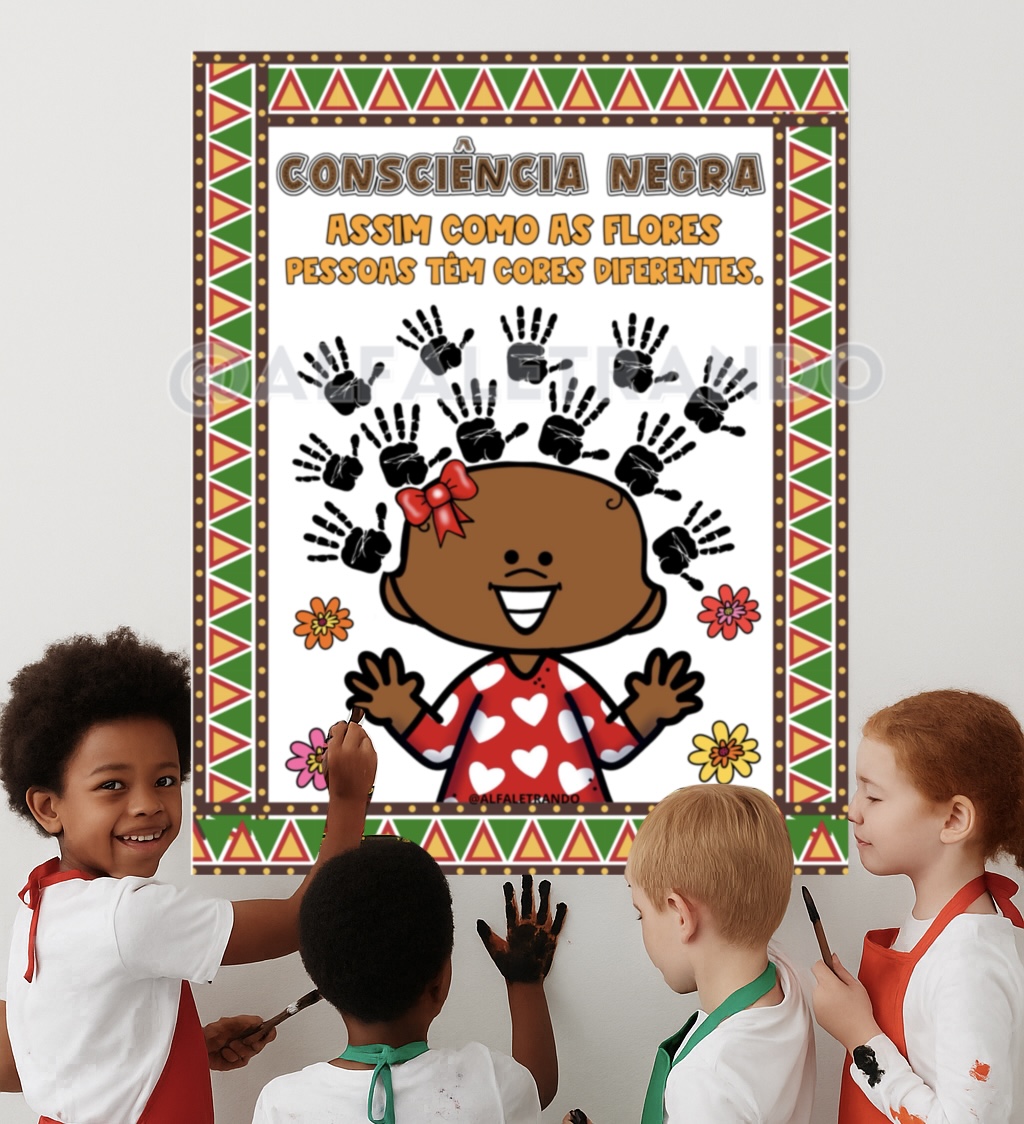 O painel conta com um mural ampliado para pintura coletiva com carimbo das mãozinhas dos alunos para exposição no dia da consciência negra. ✊🏿✊🏽✊🏾